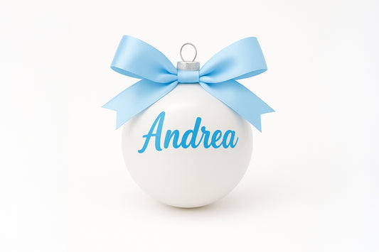 Pallina Natalizia Personalizzata – Bianca Lucida con Fiocco Rosa, Rosso o Azzurro