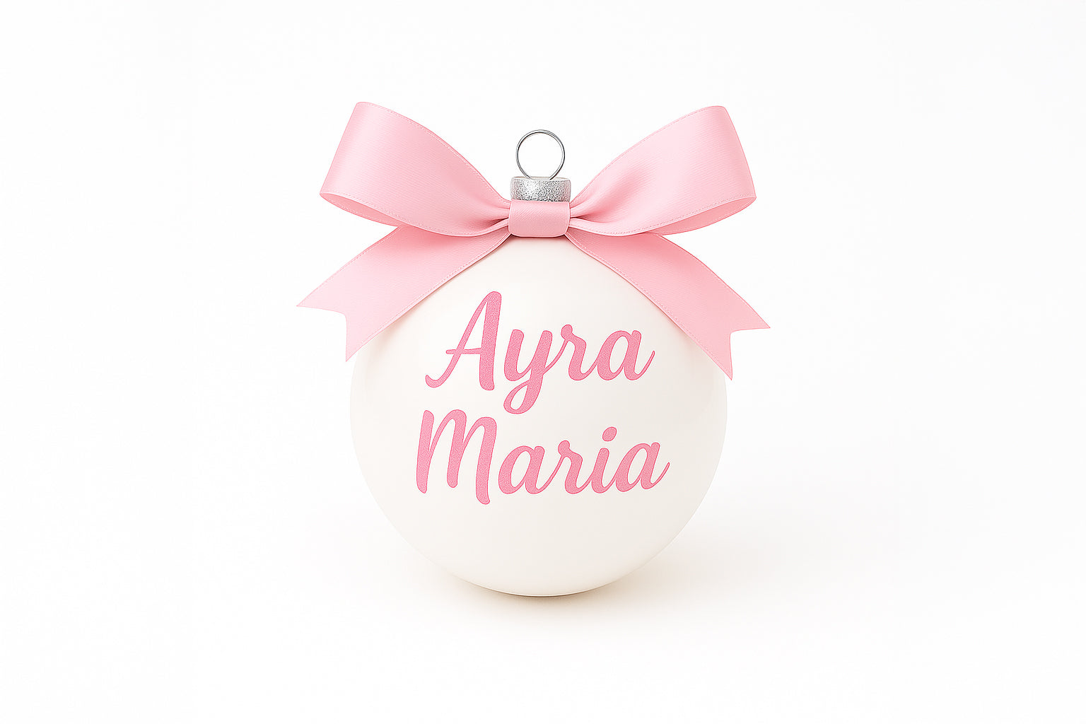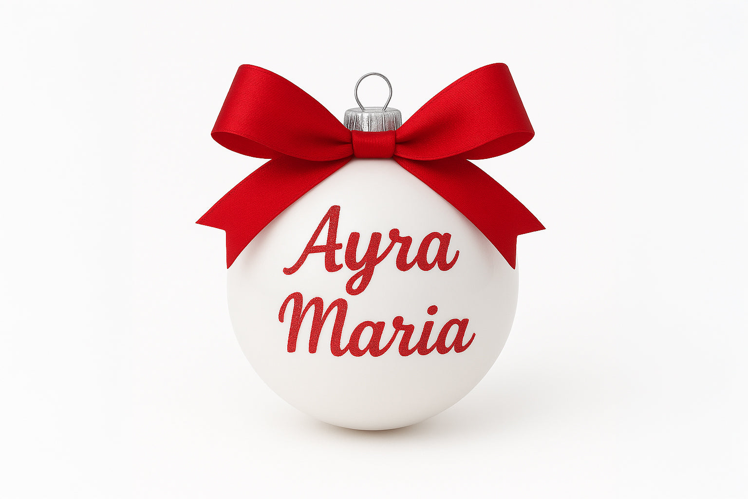 Ogni pallina bianca lucida da 10 cm viene decorata con il nome che preferisci e completata con un elegante fiocco in raso disponibile in rosso, rosa o azzurro.