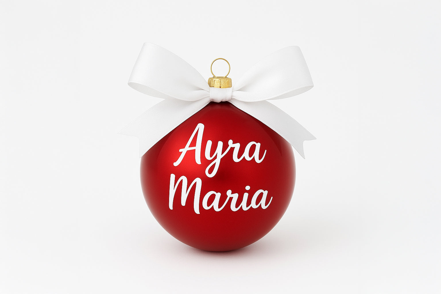 Realizzata in rosso lucido da 10 cm, è decorata con un raffinato fiocco bianco in raso e personalizzata con il nome che desideri in colore bianco.